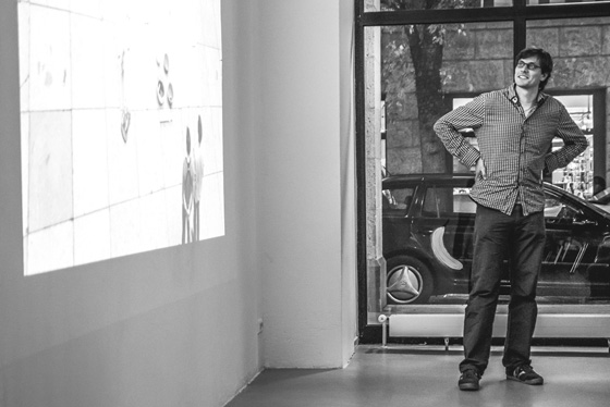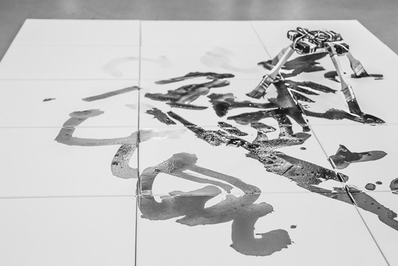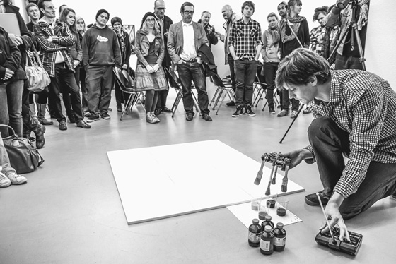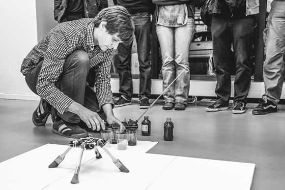 Also Geister uses primitive, clumsy „paintspiders“ with paintbrushes serving as legs and who seemingly create paintings as by-product on the floor. The influential decisive role of an artist becomes absurd in an ironical manner.