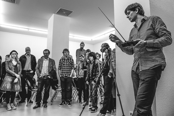 Gilbert Geister‘s images are created in events using technical devices. He can be seen as an artistic player in the background. He uses executive remote-controlled machines such as helicopters that carry paintbrushes, moving insect like devices that distribute colourful sand.